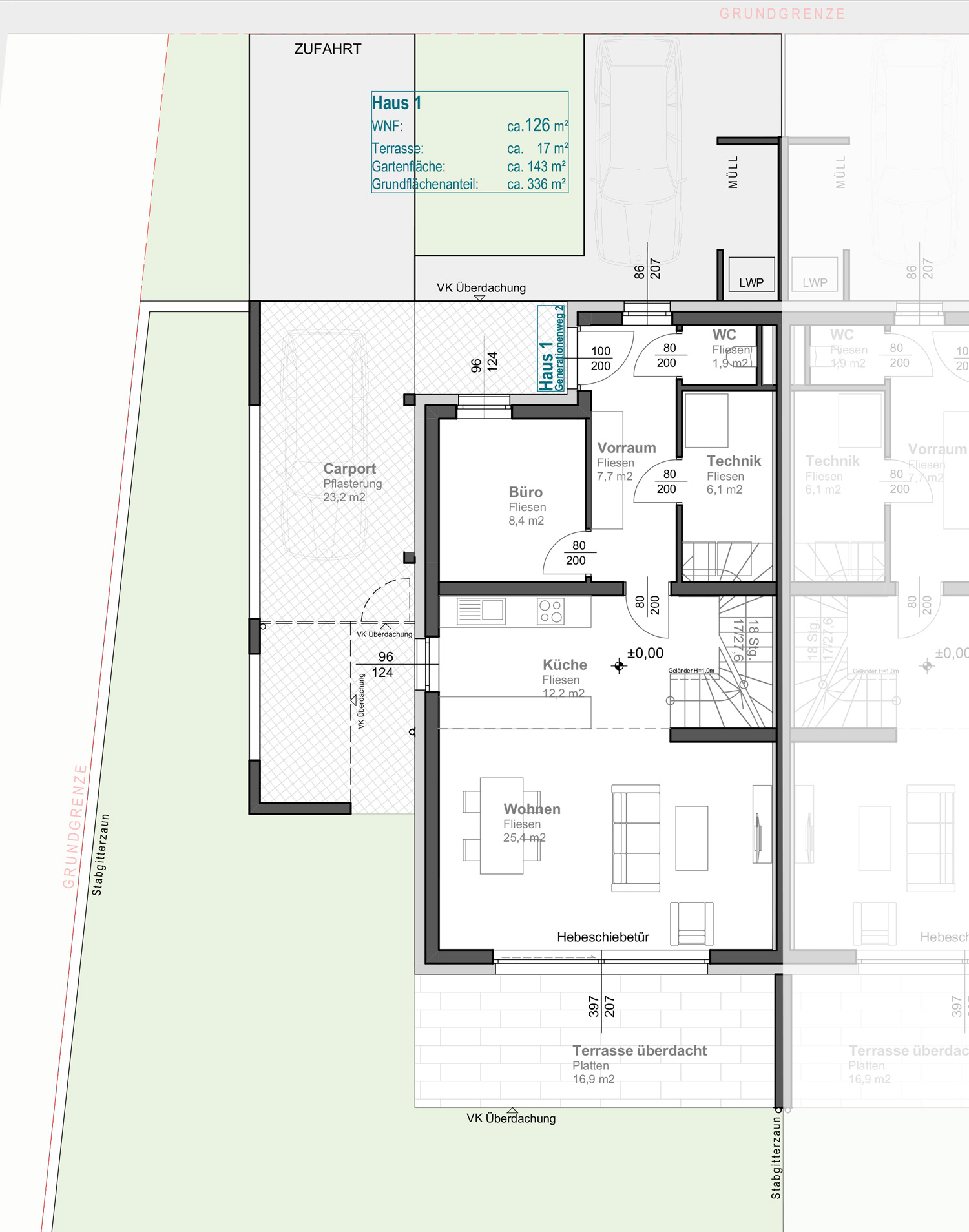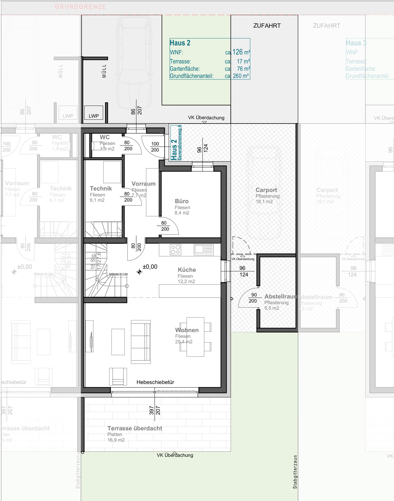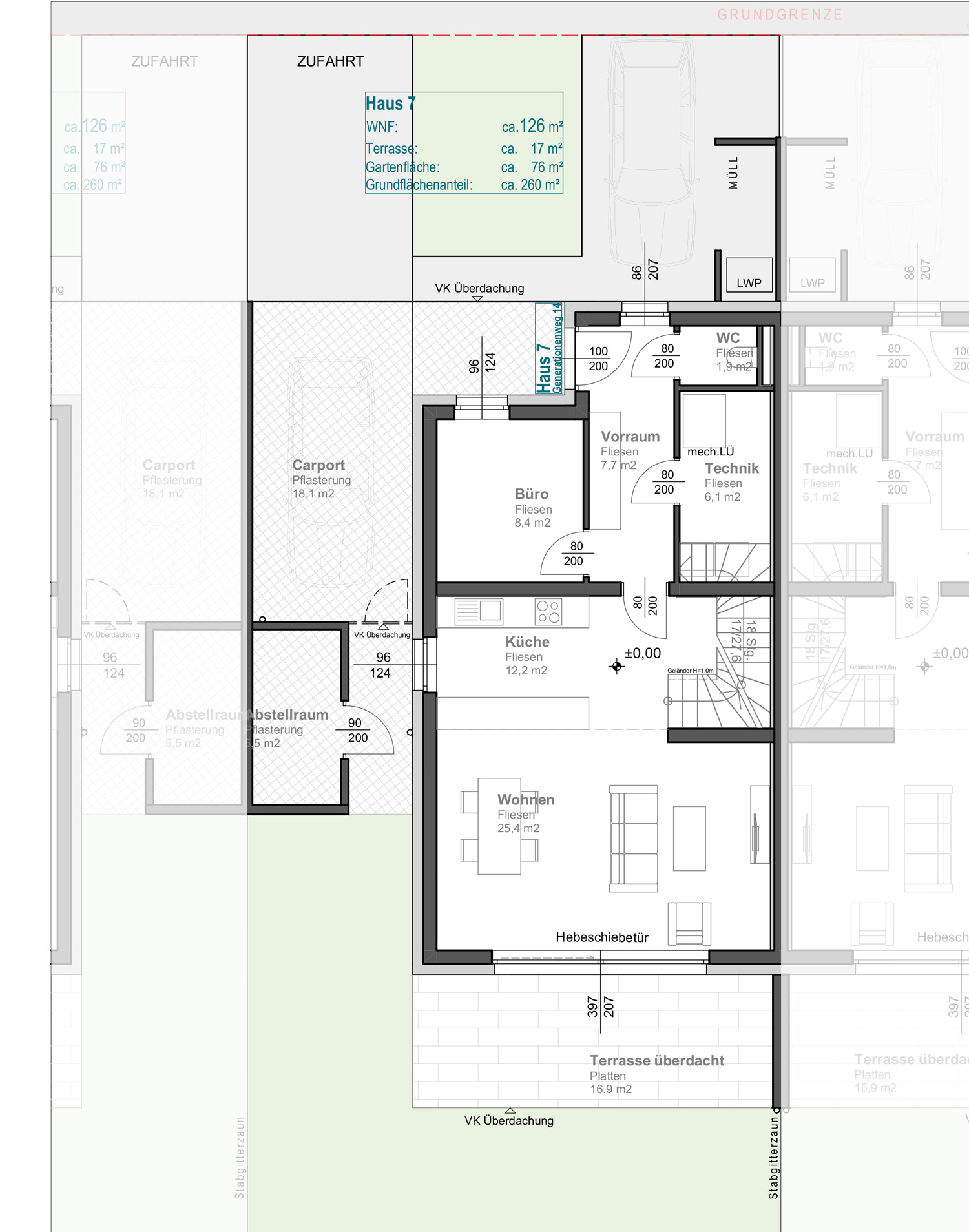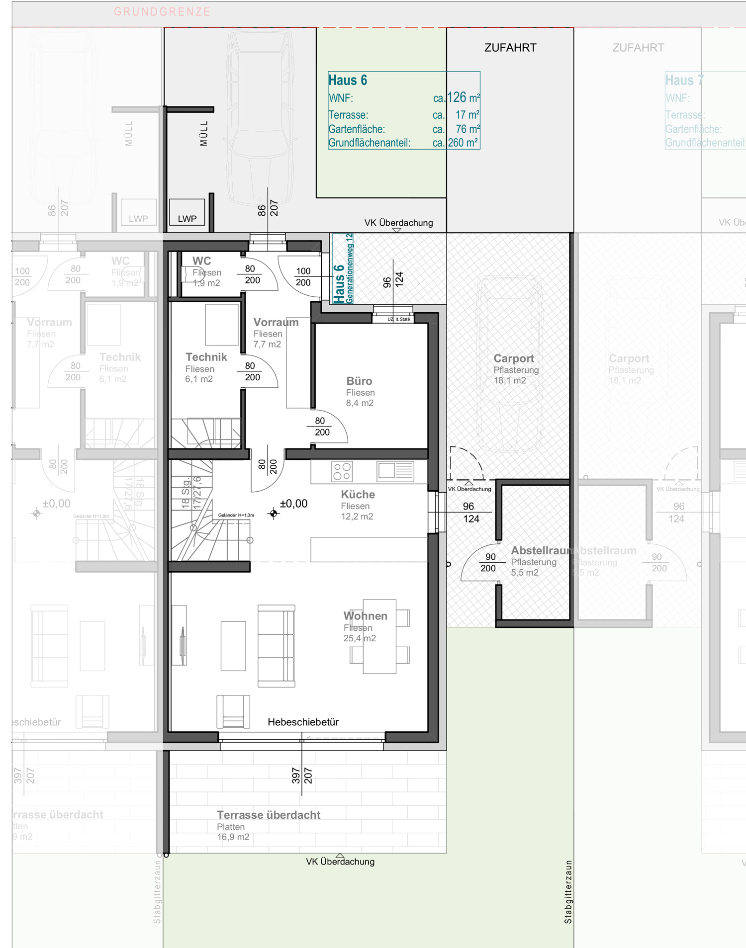 Alle Häuser verfügen über großzügige Eigengärten und 2 Stellplätze (einer davon überdacht).