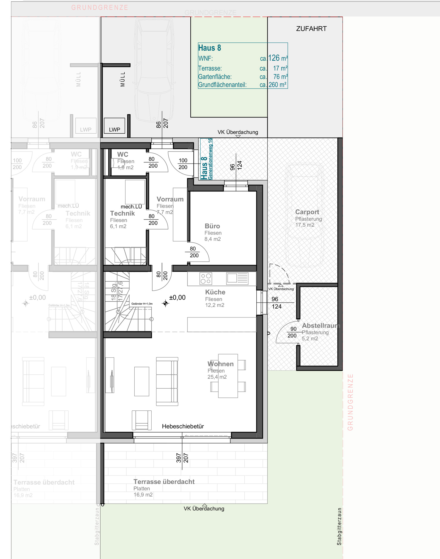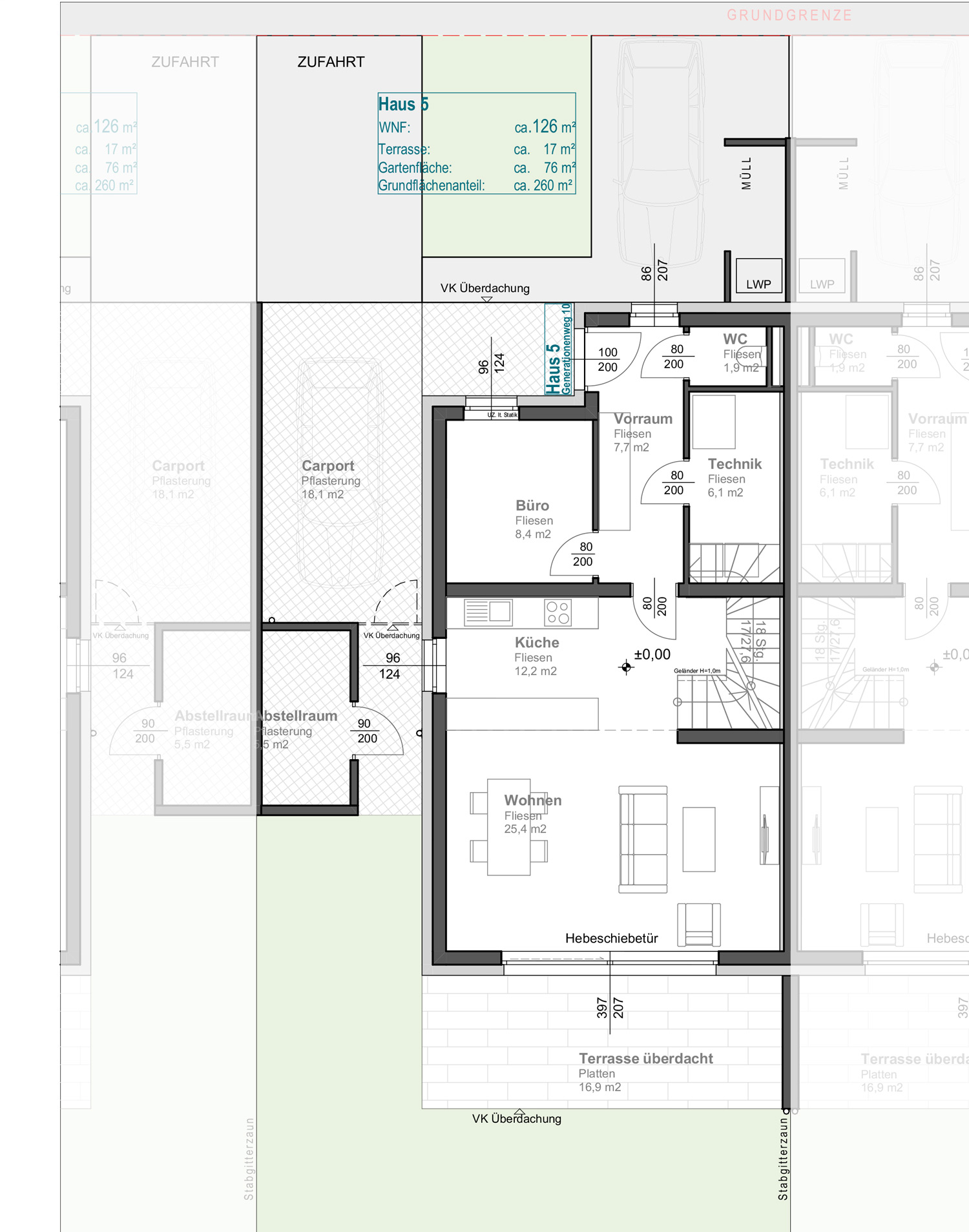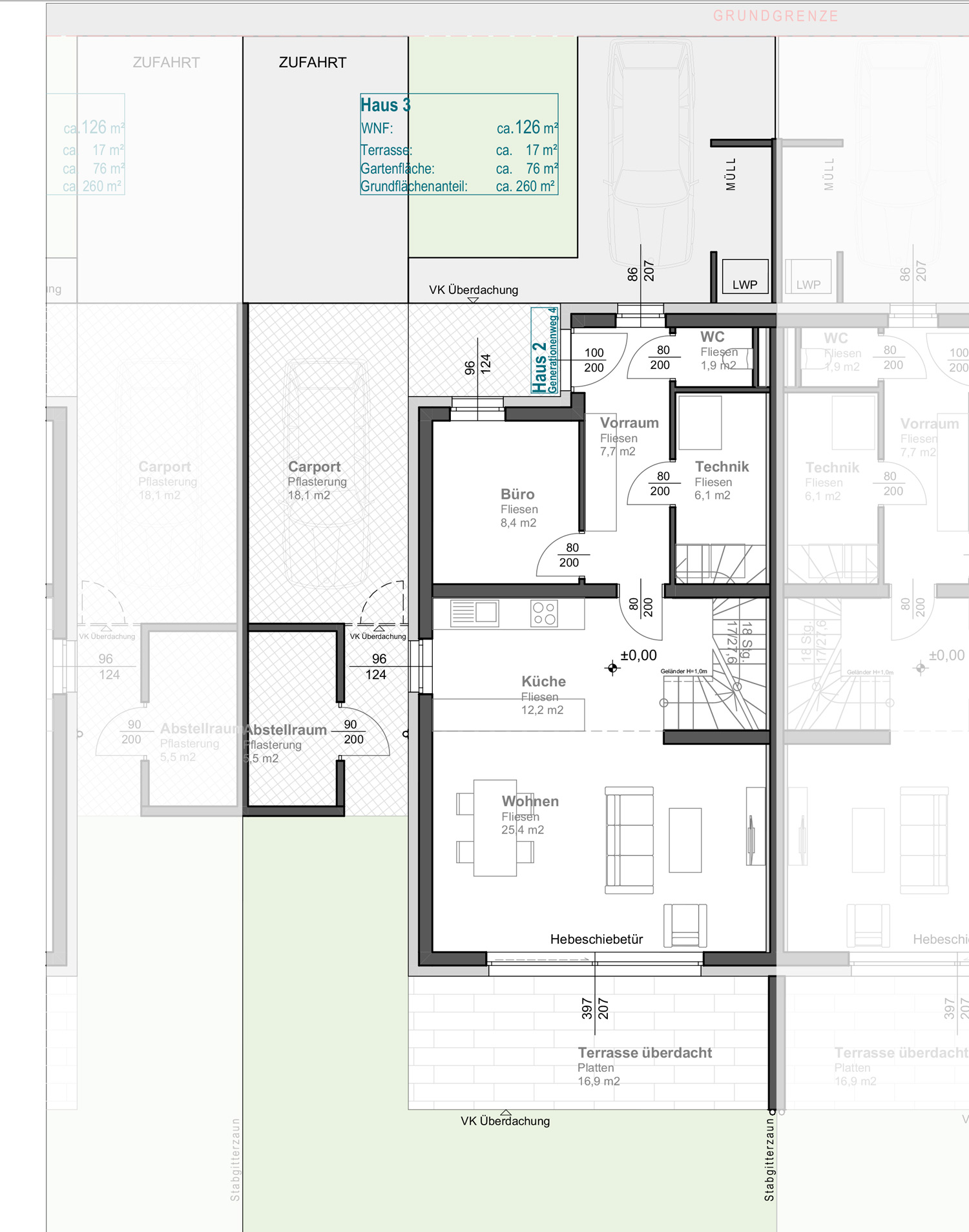 Alle Häuser verfügen über großzügige Eigengärten und 2 Stellplätze (einer davon überdacht).